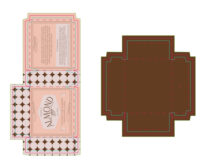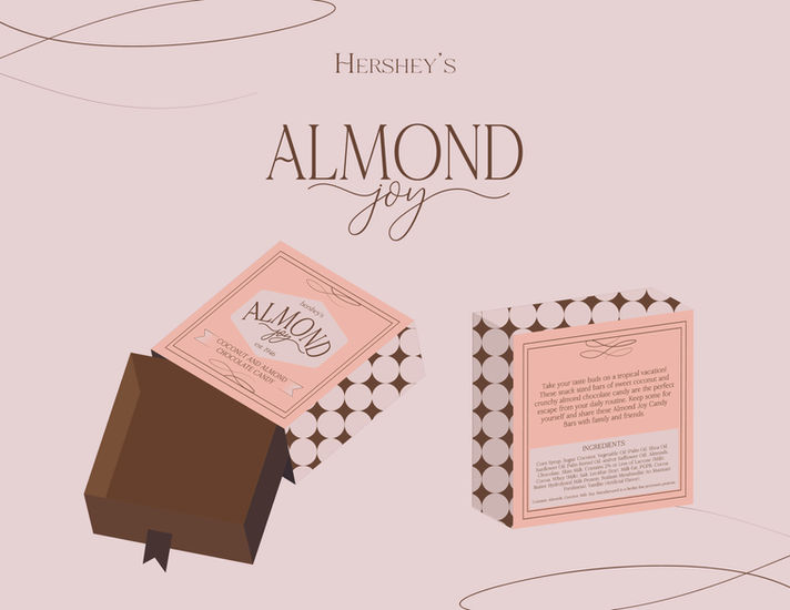 Elegance and sophistication aren’t quite what you’d have in mind when thinking about Almond Joy candies, but that was my intention when brainstorming package redesign ideas. My goal was to bring a more high-end feel to these classic coconut and almond sweets by incorporating a fancy design for a box of these chocolates.
